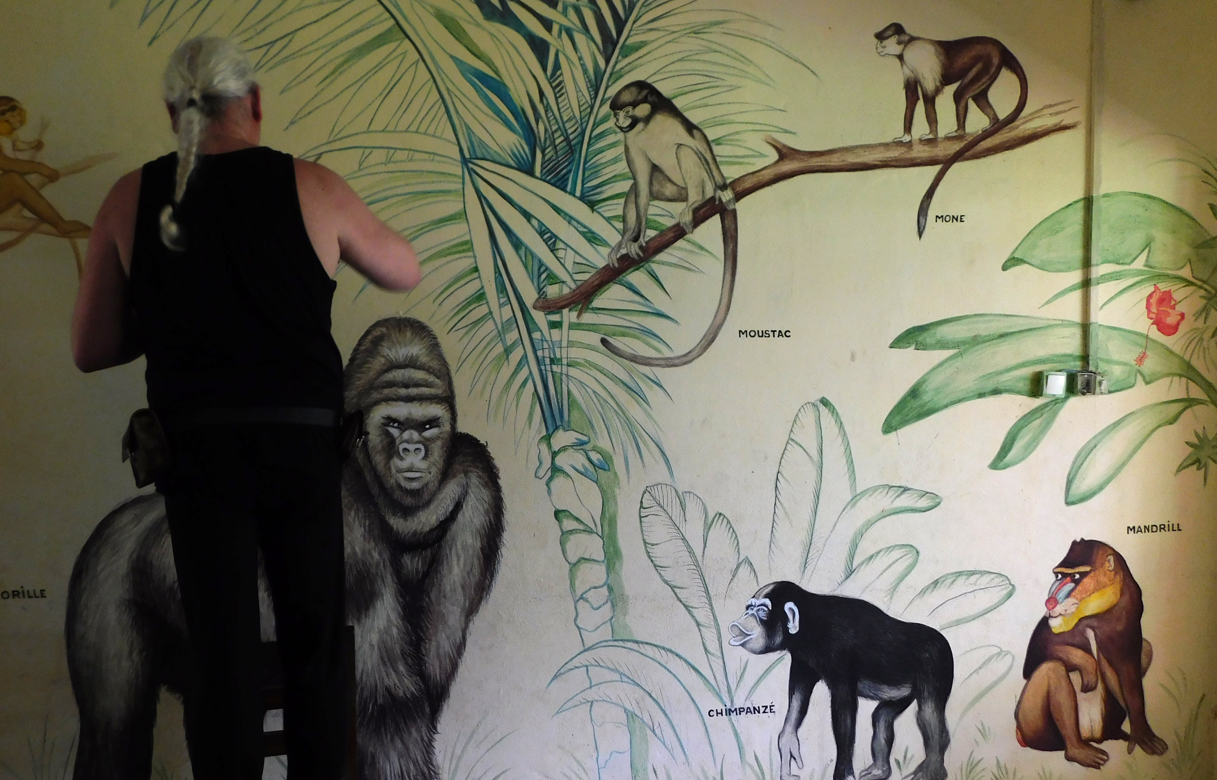 Réalisation par J-L Goss d'une fresque sur les Primates dans la Maison de Ndiva, à Ebodjé (Cameroun).