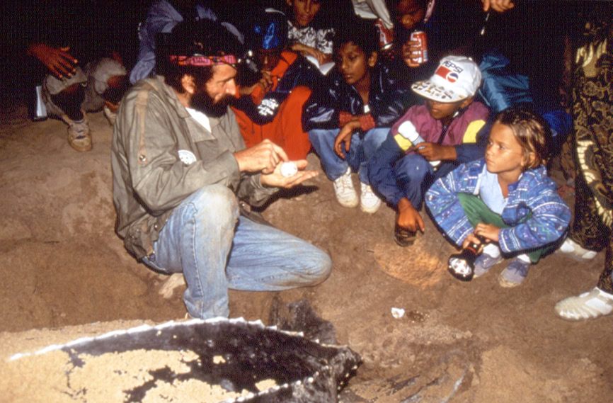 Dès 1977-78, Jacques fait le constat d’une importante destruction des nids par l’érosion des plages aux grandes marées, leur pourrissement par l’infiltration de l’eau des marais côtiers, l’autodestruction par les Luths dans les zones de grande concentration, le braconnage et le déterrage par les chiens errants des villages amérindiens. En estimant le nombre annuel d’œufs pondus et le nombre observé d’émergentes, il en déduit que le taux de réussite des œufs ne dépasse pas 4,5%. Au Surinam, les œufs de Tortues vertes et olivâtres sont incubés dans des boites en polystyrène. L'équipe guyanaise teste donc cette méthode pour les œufs de Luths. En 1974, le biologiste français Claude Pieau, de l’Institut Pasteur, avait découvert chez une tortue terrestre et une tortue d’eau douce que le sexe de l’embryon varie avec la température d’incubation pendant une période thermosensible. Jacques discute avec Pieau de la possibilité qu’un facteur identique existe chez les tortues marines. Commence alors un projet visant à vérifier avec lui si le déterminisme du sexe par la température peut se confirmer chez l’embryon de Luth. La station météo de Saint-Laurent-du-Maroni lui prête des thermographes Richard. Nous plaçons les sondes sur la plage de Yalimapo, au sein de plusieurs nids de Luths. Malheureusement, ces thermographes, dont le but initial ne nécessite pas une grande précision, ne répondent pas à ses besoins et lui fait perdre alors plusieurs saisons de ponte à tenter d’obtenir des résultats exploitables. Frédérique Rimblot et Marc Girondot travaillent sur ce sujet avec Pieau à Paris et avec Jacques en Guyane. Un ami suisse, Alain Baumgartner, inventera pour Jacques le “Thermo-Luth”, un thermomètre enregistreur avec 8 sondes.